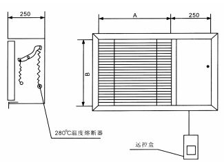 280℃溫度熔斷器自動關閉閥(防火),也可手動關閉,手動復位,可輸出聯動訊號,用排煙管道兼作通風管系統風機入口處。