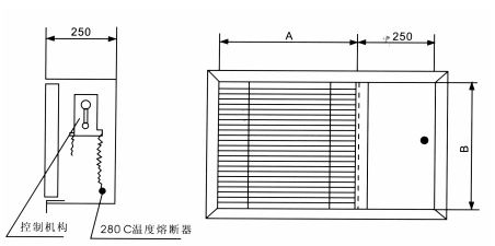 板式排煙口         電訊號開啟,手動(或遠距離)開啟。輸出動作電訊號,聯動排煙風機,用于排煙房間頂棚及墻上安裝,可設280℃重新關閉裝置。